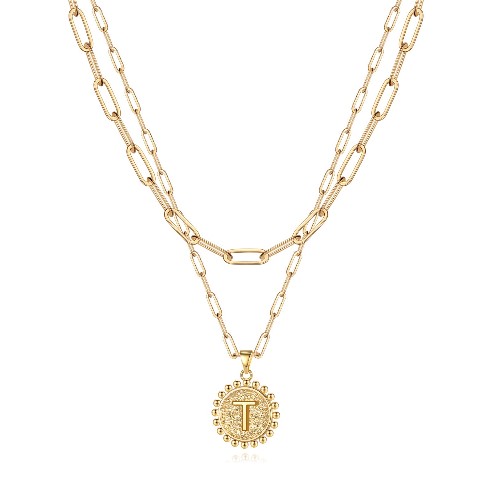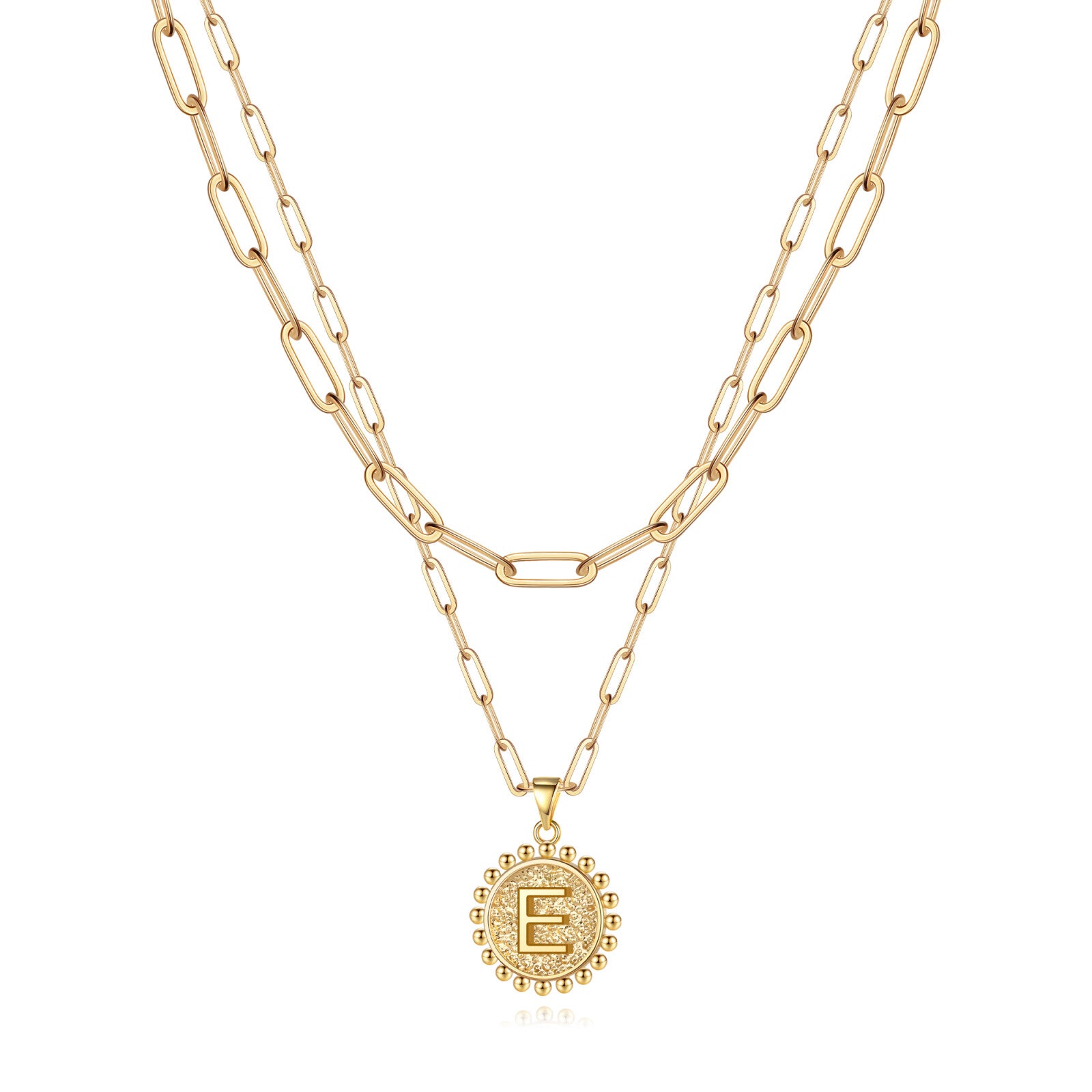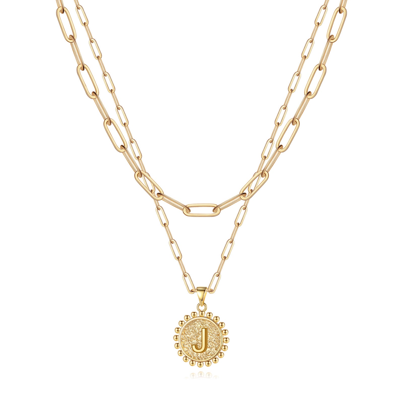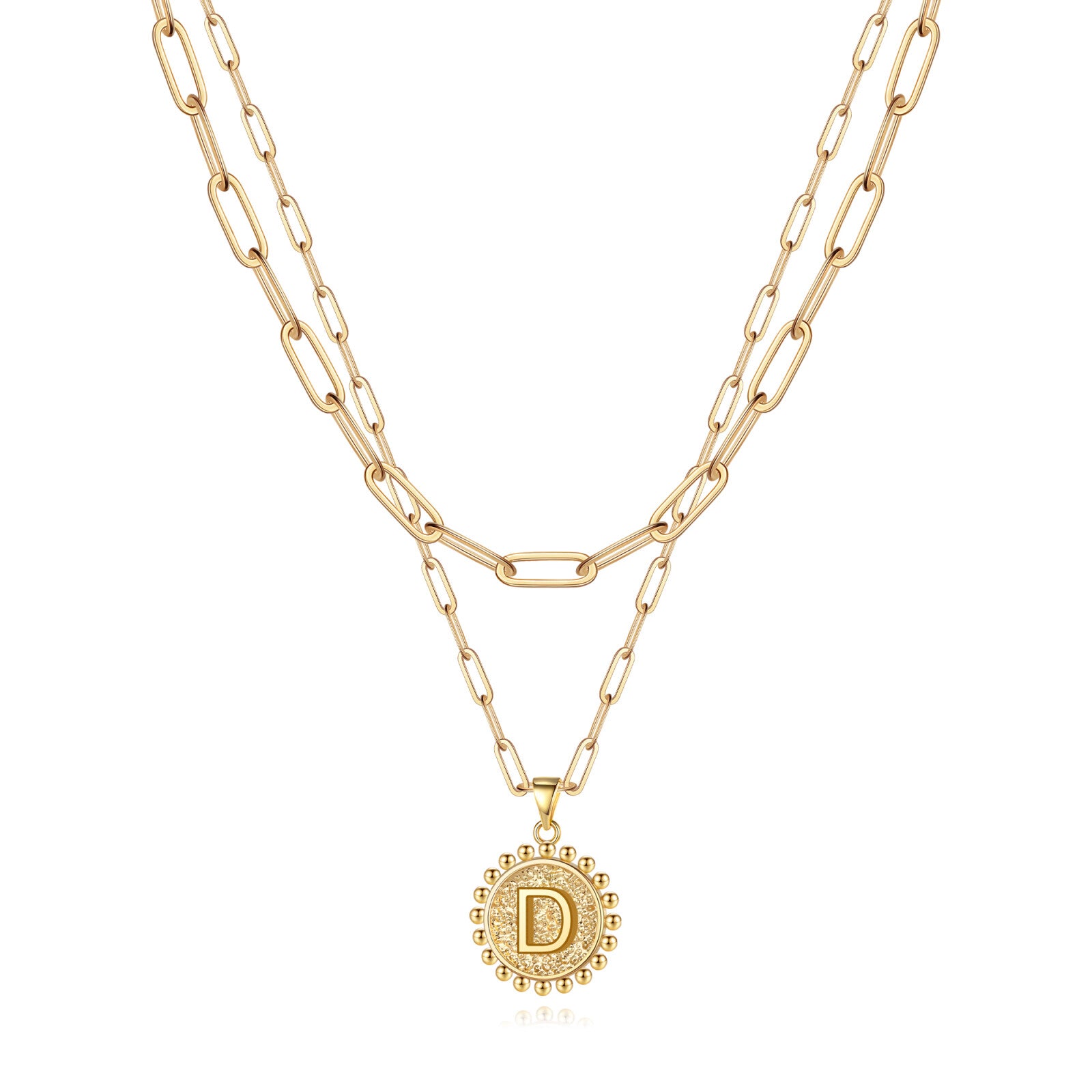 This women's letter-style commemorative pendant layered necklace conveys one's feelings through its unique design, perfectly blending fashion and emotion. The necklace features a double-layered design, with the main chain hanging a letter-shaped commemorative pendant, paired with a fine chain, presenting a clear hierarchy. It is easily suitable for various occasions such as daily commuting, date nights, and social gatherings, and is an indispensable versatile item in one's wardrobe. The necklace is made of high-quality brass, and the letter pendant is crafted with a three-dimensional relief technique, highlighting the exquisite texture. The double-layered chains have varying lengths, allowing them to naturally drape between the collarbones when worn, enhancing the neckline while adding a sense of fluidity and lightness. Multiple letters can be chosen at will, whether it's the initials of a name, the abbreviation of a special day, or a symbol representing good luck, all of which can become a unique emotional carrier. The golden commemorative pendant design symbolizes preciousness, and paired with the simple chain, it exudes a sense of sophistication. It is a heartwarming gift for birthdays, graduations, holidays, etc. The combination of the golden chain and the letter pendant is classic and eye-catching, easily adaptable to various styles: paired with a shirt or suit to add delicate details to the professional look, layered with other necklaces to create a sense of depth and instantly enhance the fashion quotient, paired with a dress. Whether for personal use or as a gift, it can satisfy the dual pursuit of quality and aesthetics.